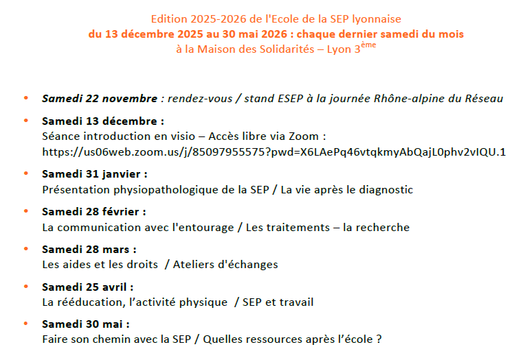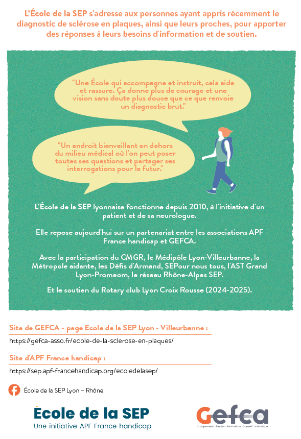Depuis 2010, APF France handicap, soutenue par Roche, propose, partout en France, les Écoles de la SEP. Elles proposent des rencontres et des temps d’échanges aux personnes concernées ainsi qu’à leurs proches.