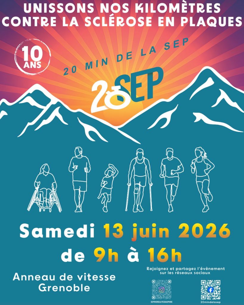 Rendez-vous le samedi 13 juin prochain à partir de 9h à l’anneau de vitesse de #villedegrenoble pour l’édition 2026 des 20 min de la SEP organisé par SEP Rhône-Alpes Dauphiné et l’hôpital de jour de neurologie du CHU de Grenoble.